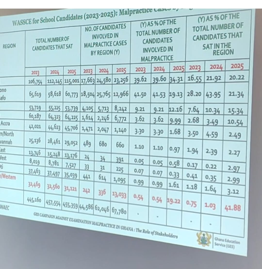 Out of a total of 31,121 candidates who sat for the exams, 13,033—representing 41.88 percent—were flagged for various forms of examination malpractice. The data further shows that the two regions alone accounted for 19.22 percent of the national malpractice cases, ranking second only to the Greater Accra Region, which recorded 34.31 percent.
