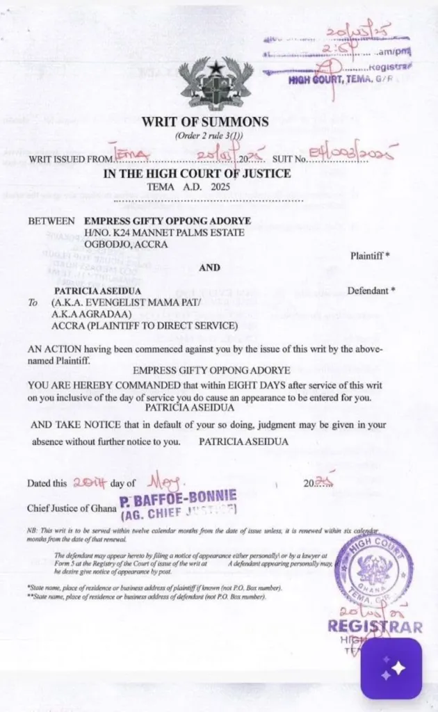 According to the writ, the Plaintiff (Empress Gifty) says that on 13th May 2025 the Defendant (Nana Agradaa) who seems to have a disagreement with the Plaintiff’s husband (Hopeson Adorye) took to her social media handles (Facebook, TikTok, and YouTube) and in a live broadcast and attacked the Plaintiff’s husband. She further spoke the following words defamatory of the Plaintiff in Twi language with its respective English translation stated below: