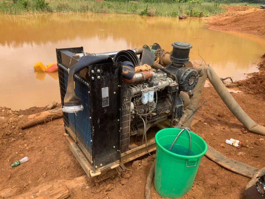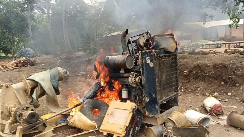 In the Ashanti Region, the task force conducted simultaneous raids in the Asante Akim and Juaso districts. Acting on intelligence, officers moved into the Asuboa Mponua area of Asante Akim, where six excavators were discovered. Two were found unserviceable while the remaining machines were immobilized. A heavy-duty water pumping machine, several hoses, fuel containers, and a wooden shelter were destroyed, while a generator set was seized.