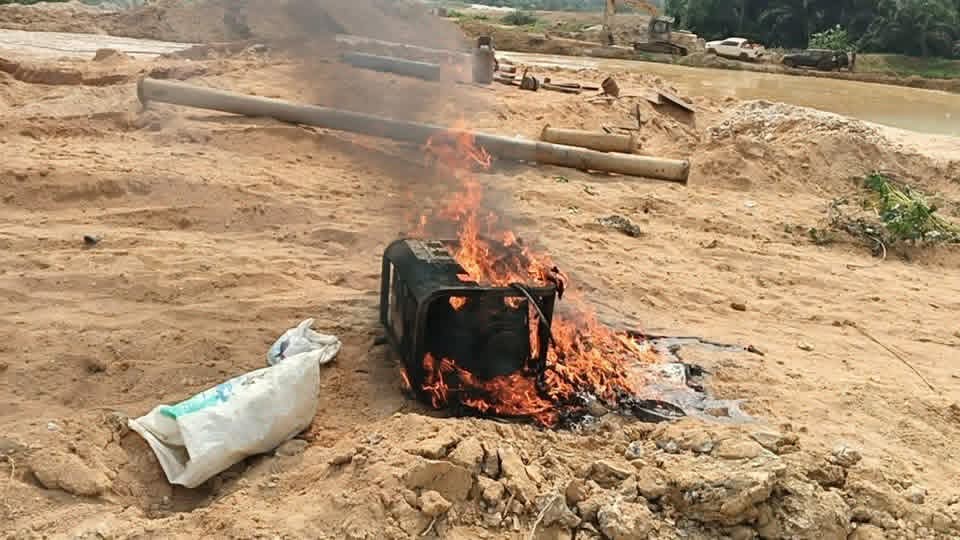 Additionally, several makeshift structures, old water pumps, hoses, and chanfang machines used for water mining were destroyed on-site.