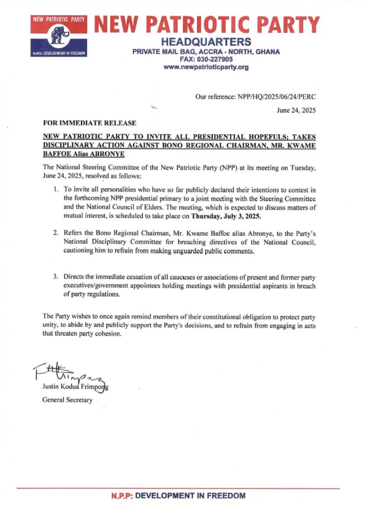 This decision was taken at a meeting held by the party’s National Steering Committee on Tuesday, June 24, 2025. According to the committee, the meeting resolved to invite all individuals who have publicly declared their intentions to contest in the party’s upcoming presidential primaries to a joint session with the Steering Committee and the National Council of Elders.