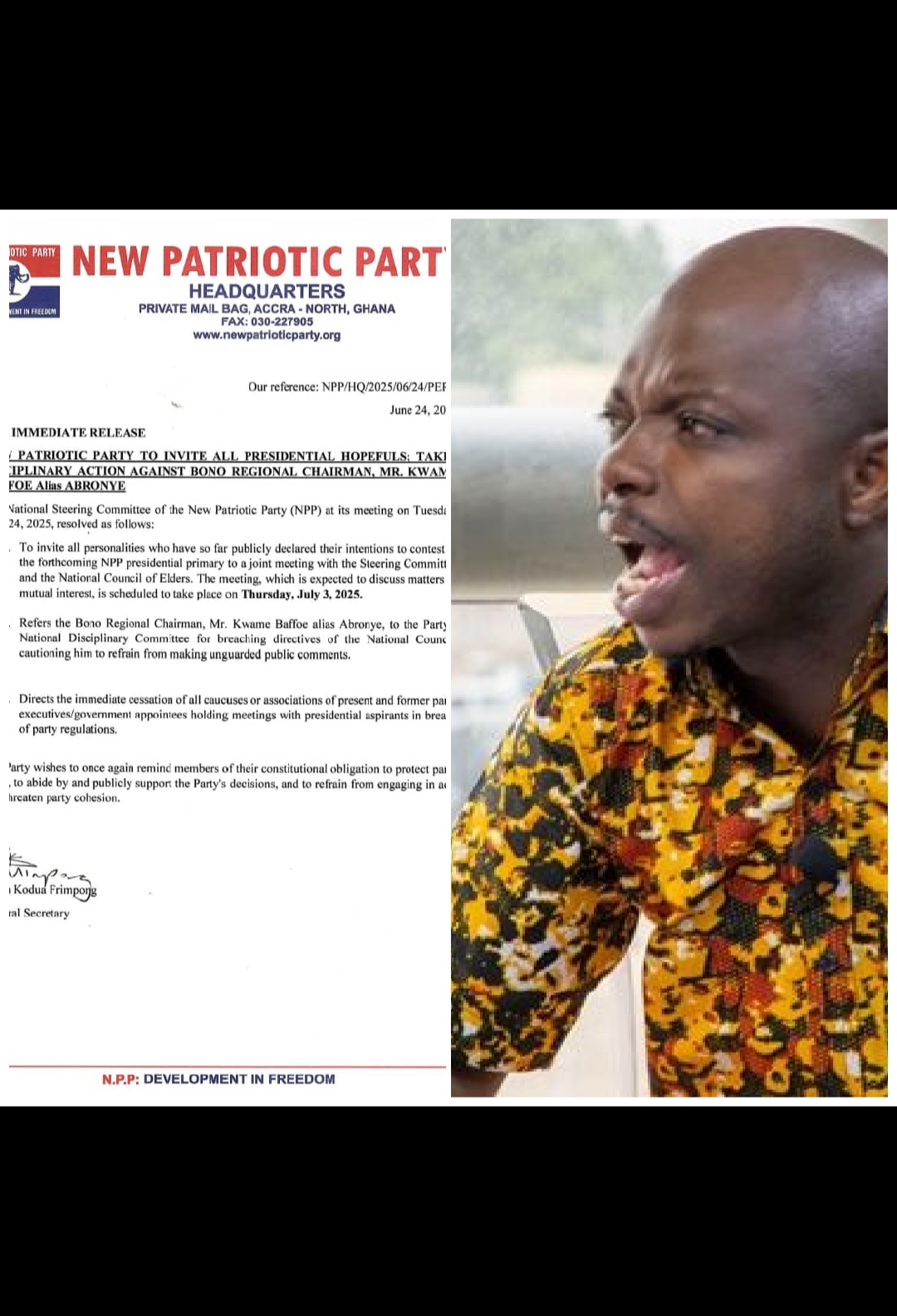 The New Patriotic Party (NPP) has taken steps to summon the Bono Regional Chairman, Mr. Kwame Baffoe, popularly known as Abronye, before its National Disciplinary Committee following concerns about his recent public conduct.