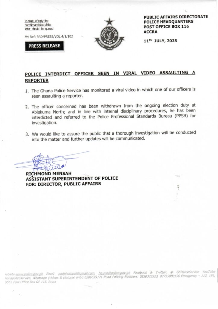 The Ghana Police Service has monitor a viral video in which one of our officers is seen assaulting a report.
